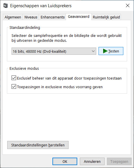 - Verhoog het geluidsvolume naar een gemiddeld niveau. Bijvoorbeeld door middel van de geluidsniveauknoppen op het toetsenbord. Klik aansluitend in het tabblad Geavanceerd op de knop Testen.
