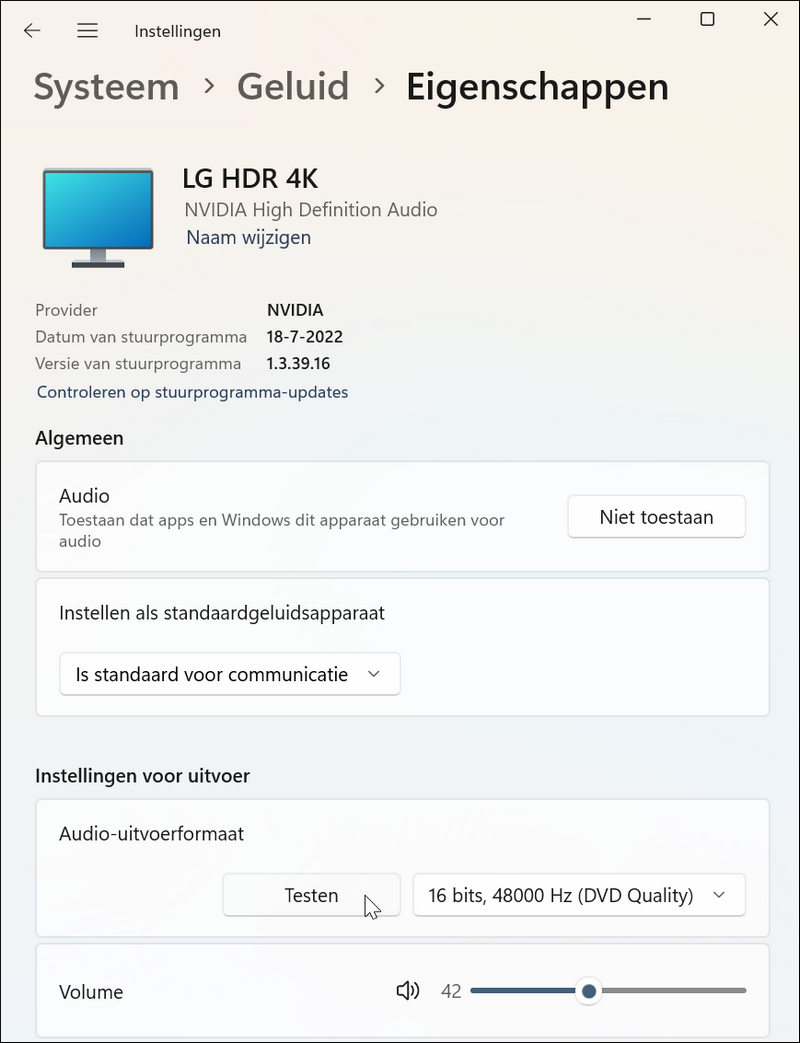 - Dit opent de Eigenschappen van je geluidskaart. Klik in de rubriek Instellingen voor uitvoer op de knop Testen.