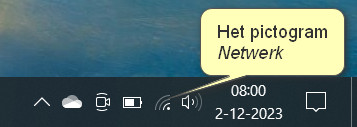 Het pictogram Netwerk in het systeemvak, links naast de klok op de taakbalk, geeft een indicatie van de sterkte van het wifisignaal. Waarbij één gebogen wit streepje een zwak wifisignaal betekent en drie gebogen witte streepjes een goed wifisignaal.