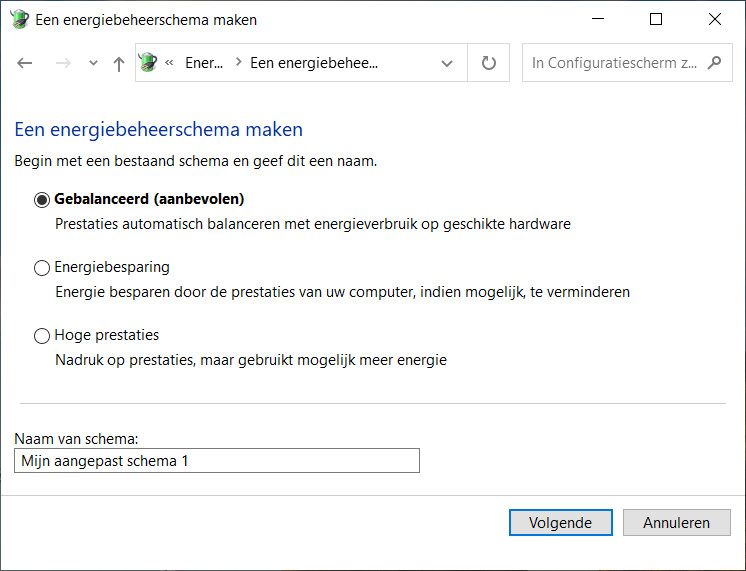 - Klik in het venster Een energiebeheerschema maken in het keuzerondje bij de optie Gebalanceerd en klik aansluitend op Volgende