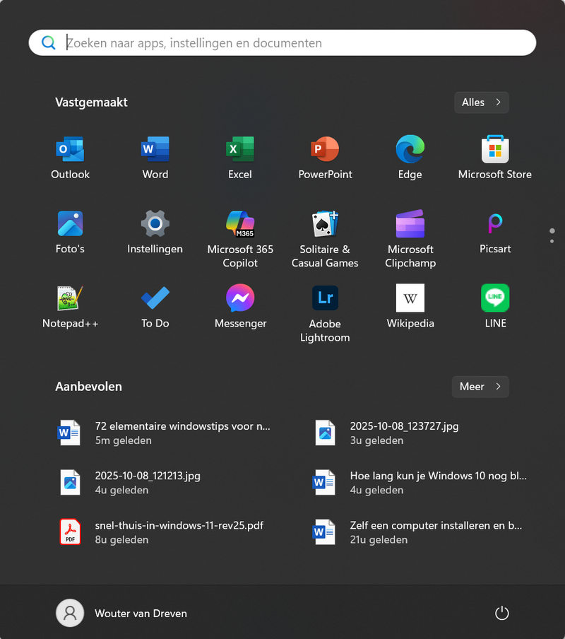 De onderstaande afbeelding laat het startmenu zien zoals we dat gewend waren in Windows 11. Bovenin vinden we de zoekbalk. Waarmee dingen opgezocht kunnen worden in Windows. Direct daaronder vind je de sectie Vastgemaakt. Daarin vind je alle apps die zijn vastgemaakt aan het startmenu. Zodat ze altijd snel binnen handbereik zijn.