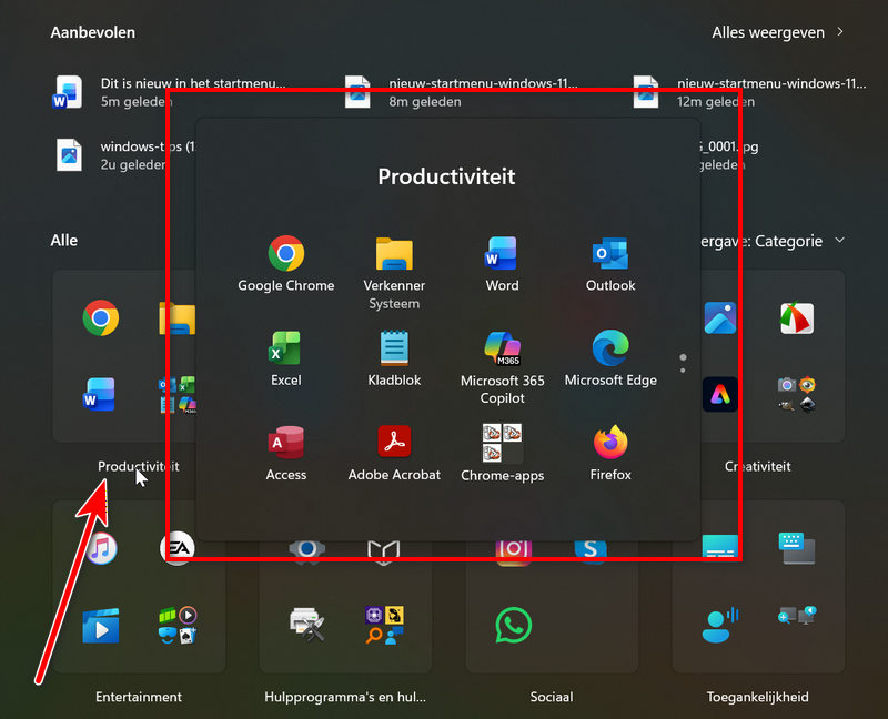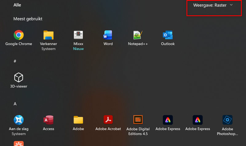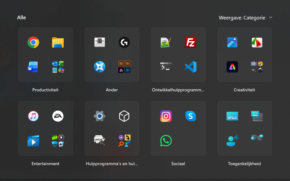 In de sectie Alle staan alle apps die op je pc zijn geïnstalleerd. Standaard worden de apps weergegeven in categorieën. Waarbij de meest gebruikte apps uit die categorie prominent worden weergegeven. Klikken op het pictogram van een weergegeven app zal de betreffende app starten.