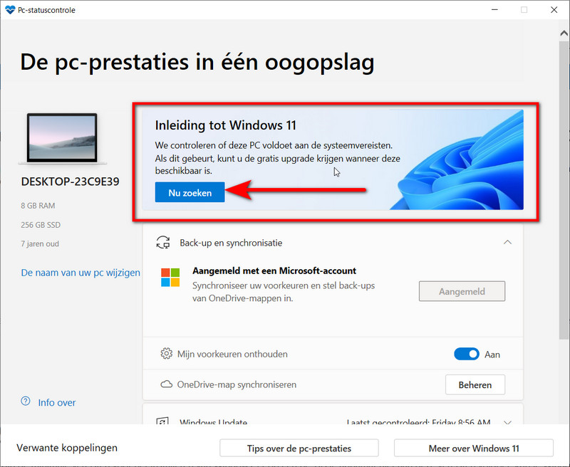 Met Pc-statuscontrole controleren of je pc geschikt is voor Windows 11 gaat als volgt: