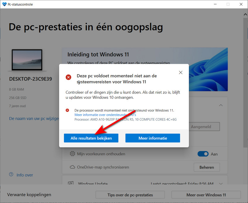 - In enkele ogenblikken zal Pc-statuscontrole je het resultaat tonen. Als je pc niet geschikt blijkt voor Windows 11, dan kun je via de knop Alle resultaten bekijken precies zien waarom dat zo is.