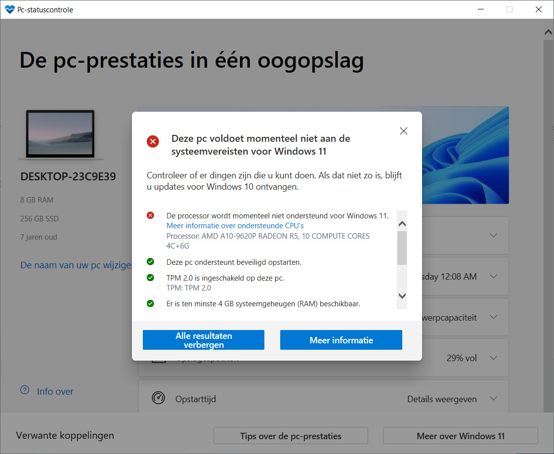 In het overzicht dat Pc-statuscontrole je vervolgens laat zien, kun je precies zien waarom je pc niet geschikt is voor Windows 11. Ook kun je met dit overzicht inschatten of je pc alsnog geschikt te maken is.