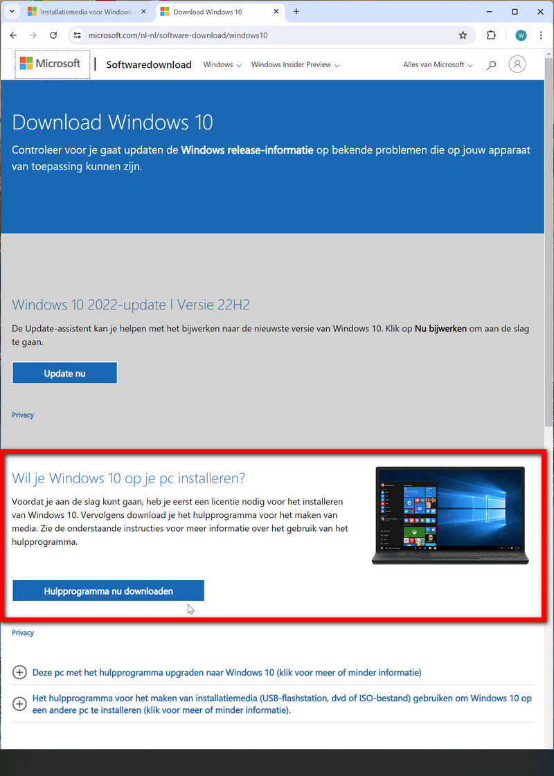 - Start je browser en navigeer naar het webadres: https://www.microsoft.com/nl-nl/software-download/windows10. ( voor Windows 11 is dit: https://www.microsoft.com/nl-nl/software-download/windows11)