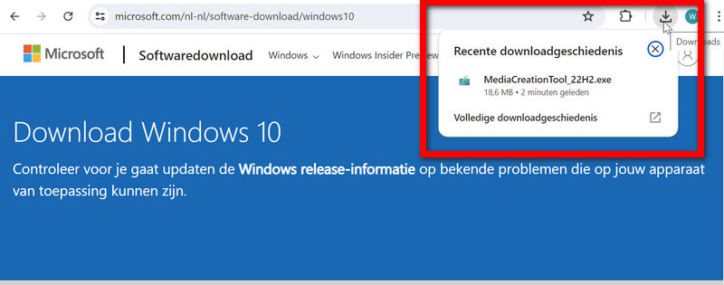 - Hiermee wordt het bestand MediaCreationTool_22H2.exe naar je computer gedownload. Je vindt dit bestand in de map Downloads op je computer.