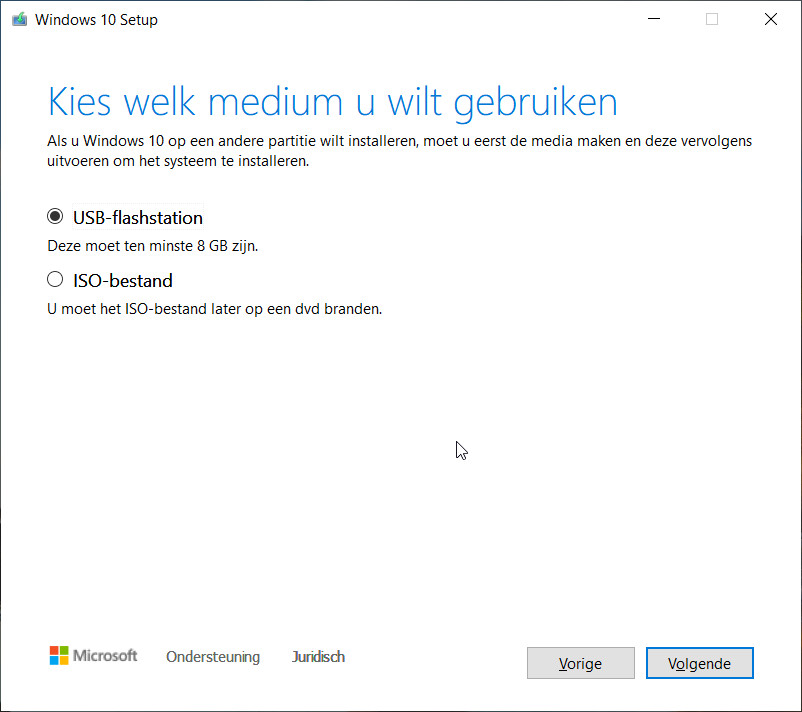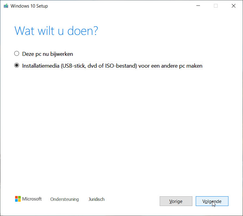 - Vervolgens stelt Windows 10 Setup je de vraag wat je wilt doen. Klik op het keuzerondje met als bijschrift Installatiemedia en klik aansluitend op de knop Volgende.
